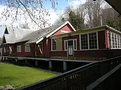 Over the years, the church added cabins and buildings.[4] The dining hall was designed in 1934 by Marvel Johnson Blomdahl, a twenty-year-old architecture student who would become one of the first female graduates of the University of Washington's School of Architecture.[5] Lots were leased to members of the congregation on which to build their own cottages. Most cabins and cottages were built between 1933 and 1936. Some lots had platforms, and visiting families would pitch their tents on the platforms. In later years, the cottage or cabin that they had built on their leased lot served as a family's summer home.[2]