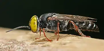 The Crabronidae are a large paraphyletic group (nominally a family) of wasps, including nearly all of the species formerly comprising the now-defunct superfamily Sphecoidea. It collectively includes well over 200 genera, containing well over 9000 species. Crabronids were originally a part of the Sphecidae, but the latter name is now restricted to a separate family based on what was once the subfamily Sphecinae. Several of the subfamilies of the Crabronidae are often treated as families in their own right, as is true of the most recent phylogenies (example below).