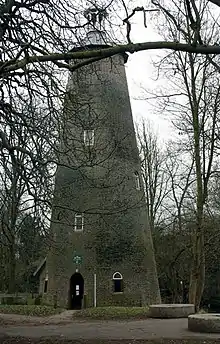 The Hounslow Gunpowder Works opened in the late 1760s in what is now the western end of the park. Crane Park Island was created to provide a mill pond for the water to drive the machinery. There were many explosions and the Shot Tower (pictured right) is now thought to have been a windmill for recirculating water to power the mills, rather than a shot tower for making lead shot. The licence to manufacture gunpowder was withdrawn in 1927, and part of the site was sold to Twickenham Council, which turned it into Crane Park. This opened in 1935, and was inherited by Richmond Council when Twickenham Council was abolished in 1965.[1] The Shot Tower (now officially the Brick Tower) is a Grade II listed building.[5]