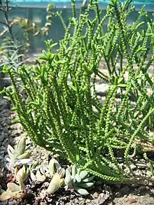 Crassula muscosa has very small, light green leaves that are densely packed around a thin stem, and the arrangement of the leaves around the stems gives them a square shape.[1] It grows as an intricate bush with very small yellow-green flowers, with a maximum height of 15–20 cm.