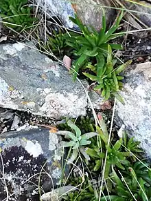 Crassula nudicaulis is a perennial succulent herb with a thickened taproot and several low rosettes of basal leaves. Plants are somewhat variable in appearance and there are several subspecies over the plant's wide range.