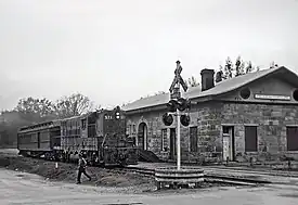 The depot, when it was still active in 1967, with an Atlanta and West Point Railroad train on the tracks.