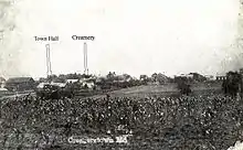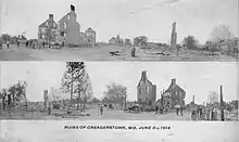 On June 2, 1914, around 10 am, a major fire broke out in Monocacy Valley Creamery and destroyed about 30 buildings,[3][4] causing somewhere between $60,000 and $70,000 worth of damages.[6] The fire was caused accidentally when a spark from a fire set by a man in the creamery ignited the roof. Strong winds fanned the flames, allowing the blaze to cross the road and gaps between buildings. Creagerstown had no fire department to put out the fire. The town hall was burned down and the fire also destroyed all of the hotels owned by the Valentine family, though the Valley Hotel was eventually rebuilt.[3] Between 1920 and 1930 a number of houses in the town were reconstructed. But by 1930 other road improvements and other highways, such as the Frederick and Emmitsburg railroads, had been constructed throughout Frederick and Creagerstown never recovered.[3][4]