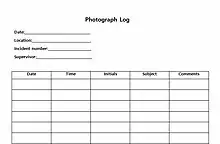 The responding officer must also maintain a photo log if any photographic documentation is taken. The log should contain the date and time of the photograph, the subject matter, and any additional notes. These logs must be maintained within a case file or incident report, as they are a part of the examination record and discoverable material at trial.[7]