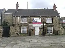 The lintel above the door is inscribed "NTG 1658" with the N reversed; the initials may have stood for Thomas Godfrey Newbould, a prominent Quaker and landlord. The building overlooks the village stocks as well as the cross. Although it has mostly been used as a pub, in more recent years it has been used to house various restaurants.[2][3][4]