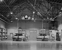 The turbine building was modified to take more equipment, resulting in a rearrangement of the walls to enlarge it and addition of a gable to it, similar in appearance to that on the generator building. It has a much higher floor than the generator building and received a pair of vertical turbine/generator sets.[14]