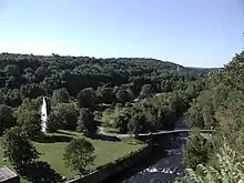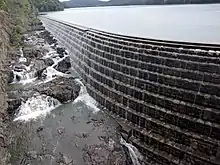 Croton Gorge Park is a park in Cortlandt, New York owned and operated by Westchester County. It consists of 97 acres (39 ha) at the base of New Croton Dam, which is one of the largest hand-hewn structures in the world(after the Great Pyramids and the Great Wall of China).[1] The park is a popular venue for fishing, picnicking, sledding and cross country skiing.[2] The Old Croton Trail begins in the park, which also includes a baseball field and an impressive fountain occasionally operated with high pressure water from the reservoir. The fountain was reopened in 2000 after having been out of service since the mid twentieth century.