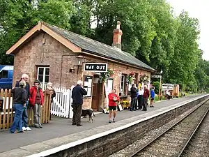 Located in a small local valley, the station stands at the highest point on the line, just under 400 feet (120 m) above sea level.[4] The station has been designated by English Heritage as a grade II listed building.[5] The railway workers' cottages and station master's house, together with the main station building, are the only original structures left. A display of permanent way can be found on the western platform and includes a portion of 7 ft (2,134 mm) broad gauge "baulk road" as was originally used on the line.[3]