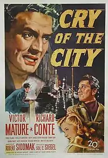 Cry of the City is a 1948 American film noir starring Victor Mature, Richard Conte, and Shelley Winters. Directed by Robert Siodmak, it is based on the novel by Henry Edward Helseth, The Chair for Martin Rome. The screenwriter Ben Hecht worked on the film's script, but is not credited. The film was partly shot on location in New York City.[1]