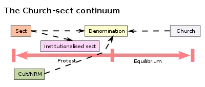 Becker further bisected Troeltsch's first two categories: church was split into ecclesia and denomination; and sect into sect and cult.[29] Like Troeltsch's "mystical religion", Becker's cult refers to small religious groups that lack in organization and emphasize the private nature of personal beliefs.[30] Later sociological formulations built on such characteristics, placing an additional emphasis on cults as deviant religious groups, "deriving their inspiration from outside of the predominant religious culture."[4]: 349 This is often thought to lead to a high degree of tension between the group and the more mainstream culture surrounding it, a characteristic shared with religious sects.[31] According to this sociological terminology, sects are products of religious schism and therefore maintain a continuity with traditional beliefs and practices, whereas cults arise spontaneously around novel beliefs and practices.[32]