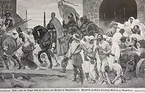 - In 1906, Arthur Kampf created the monumental wall painting, Otto des Grossen Beziehungen zu Magdeburg (German King Otto the Great (912-973) and his relation to the city of Magdeburg), composed of three parts: The left part of the painting,Otto I und Edith betreiben die Befestigung von Magdeburg (Otto I and Edith running the Fortification Magdeburg); the mid part, Otto I zieht als Sieger über die Slawen und Wenden in Magdeburg ein (Otto I, conqueror of the Slavs and the Wends, enters the city of Magdeburg); the right part, Otto I and Adelheid nehmen Abschied vom Grabe Ediths, seiner ersten Gattin (Otto I and Adelheid at the grave of Edith, his first wife).[82][83]