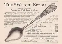 - Daniel Low, a jeweler in Salem, Massachusetts, began selling souvenir sterling "Witch" spoons in 1890, using two different patterns, the first with three pins, the word "Salem", and a witch on a broom. (See right)