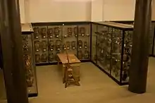 The process involved when creating a collections storage area usually involves determining the available resources, the needs of the specific collection, how the collection will be used, and the necessary space required based on the current collection and potential future acquisitions.[1] The accessibility of objects in storage, as well as the need to retrieve them, will have an effect on the type of storage space desired. If only a small portion of the collection is regularly utilized, then a separate more easily accessible storage space may be chosen for these objects, while less utilized objects may be held in a less accessible area of the building, or an offsite facility.[1] In either case, collections storage spaces are typically separate from all other activity in order to decrease the potential for damage to the collection from theft, tracked in soil, excessive light exposure, etc.[2]