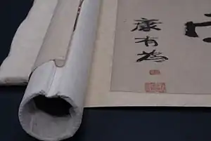 Rolls are a preferred way to store certain textiles because they help to avoid creasing or stretching. The method typically involves rolling textiles around a cardboard tube that has been covered with acid-free paper, or some other barrier, and then a plastic cover is wrapped around the rolled textile, with the ends loosely tied, to protect from dust.[1] Rolled textiles can be placed on a shelf, but a preferred method is to suspend them horizontally by the ends of the tubes, which keeps the textiles from being damaged by pressure.[1]