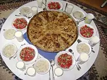 The next day, the bride had her head tied with a head wrap and was brought out to the courtyard while a boy led her to the well. The bride would get a bucket of water from the well with the boy and they would help each other wash their hands. After the wedding, the bride would become a part of the family and within the week, her father-in-law would take her and go to spend a night at her parents' house. After a month, the bride's family would take her to spend a week with them where she would bring them food consisting of two loaves of bread and pies; the same food would be brought back to the groom's house and the pie is shared with everyone on the street. [1]
