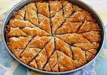 • Baklava is one of the traditional pastries of the Albanian cuisine. Although of Turkish origin, baklava's preparation and recipe is a small heritage that is passed on generation to generation in Kosovo as well. There are a few different ways of making baklava, (varying from the way it is rolled) or what kind of nuts and fruits it contains.