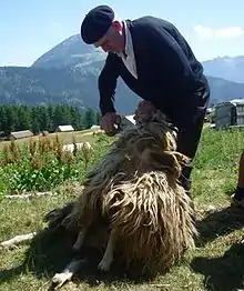 Traditional rite of shearings so far was held in the mountains of Roshkodol, in Zllonopoje in the mountains of Prilep, In the mountains of Lumbardh etc. Shear tradition was maintained with major challenges. Some shearer that have started from childhood to know the shorn 12 types ranging from the round shape, with the sequence, the moon, the star, in the form of a serpent, with a trap ....and many other forms. Sheep which holds terrkaqen - or knell sheep to be shorn in order to be of particular because the herds of sheep must be distinguished. But note that this is related to the particular arrangement of shearers, shearer ranging from the oldest, the best shearer, the shearer who shears the rams and the shearer that shear the sheep The - bell. "Ogiqet" aren't sheared, because not counted by years or fawn, but counted with years it has not been shaved. This ritual is among the oldest rites. Even this is a job of art. For a long time, wool was the raw material used by the family to ensure clothing for the entire year. Shearing of sheep was done in a ritual way. The period of shearing began in the middle of summer, when they had nearly finished all the house duties of the summer. The shepherd would invite shearers and other people to honor them. For this day, besides a sheep being slain for the meat for the guests, other traditional dishes were also prepared. Breakfast was served usually with corn bread and thickened milk, and for lunch, apart from other foods, boiled cream was served; a special mountaineers food. In Deçans mountains the sheep are usually sheared in rows, randomly in four or five rows. The best shearer shared the dark sheep. There is also a traditional element that should not be omitted: the one who sheared the rams at dinner is served the sheep backbone and the dearest guest is served its head.[21]