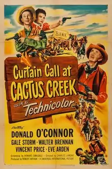 Curtain Call at Cactus Creek is a 1950 American Western comedy film starring Donald O'Connor and Gale Storm. In the story, a traveling entertainer (O'Connor) gets mixed up with bank robbers.