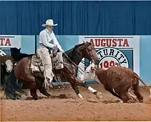 The goal of cutting is to separate a cow from its herd and prevent it from returning. A person riding the horse in competition wears western clothing, including a cowboy hat. The horse is ridden with a western-style cutting saddle and a bridle.