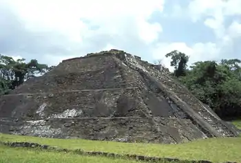 At the top of this structure, a two-meter-high (6.6 ft) monolith was found; it has evidence of having been re-modeled in three occasions; the last one, with Aztec influence occurred in 1400 CE.[1]