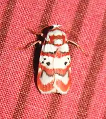 It has white palpi and the lower parts of the frons are scarlet. The tegulae are edged with scarlet, scarlet bands across thorax and patagia and on meta-thorax, less scarlet, the fore coxae, mid femora, and hind tibiae and femora are white and the abdomen is tinged with scarlet above except towards the base. Forewings with subbasal scarlet line expanding at costa, an ante-medial line bent inwards to the costa and slightly edged by black on the inner side. There is a postmedial line slightly edged by black on the outer side and bent inwards above vein three. There is a black spot in the upper angle of the cell and two on the discocellulars, and a brownish mark beyond the postmedial line below the costa, a terminal scarlet band running from the apex to the postmedial line. The hindwings have the inner area and termen tinged with scarlet.[2]