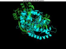 CcoA and GcoB are closely interlinked, acting as an heterodimer in solution. The surface of GcoB has an acidic patch that must interact with the matching basic region in GcoA. It is assumed that the part of GcoB interacting with GcoA is at the intersection between the FAD binding domain and ferredoxin domain. To achieve this GcoB would have to go through some structural change, which would represent a new class of P450 systems (family N).[5][6][7]