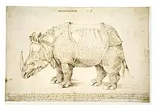 Preparatory study for the rhinoceros print by Albrecht Dürer, 1515 (British Museum: SL,5218.161 ). The inscription bears an incorrect date (1513) for the arrival of the rhinoceros in Lisbon, which actually occurred in 1515.[18]