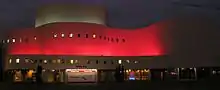 The present theatre was commissioned by the city of Düsseldorf during the tenure of Stroux.[1] The Operettenhaus, which had served as a venue for performance of plays after World War II, proved too limited. In 1957 a new building was proposed, for which the site, on Gustaf-Gründgens-Platz, was secured in 1958. An international competition was held in 1959 and won by Pfau. The theatre is designed like a sculpture, juxtaposed to the nearby Dreischeibenhaus. The style has been described as organic architecture. The great hall (Großes Haus) seated 900 people then (now 760), the small hall (Kleines Haus) 300.[2]