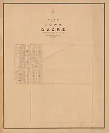 The town was first surveyed in December 1863 by Theophilus Heale, who was the chief surveyor of the region. It appears to be unknown where the name "Dacre" comes from, further backed up by an article from the Mataura Ensign in 1912, which states that: