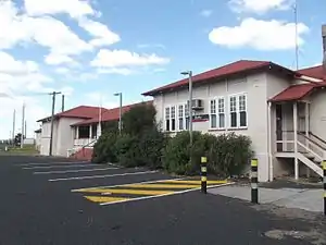 Dalby railway station is located on the Western line in Queensland, Australia, serving the town of Dalby. The station has one platform with a passing loop and opened on 16 April 1868.[1] The Dalby station has had 3 station building over its lifetime, the first built at the western end of the platform. This was removed and a new building built at the eastern end of the platform so that an additional platform could be constructed to service the newly created branch lines to Tara (which would eventually stretch to Meandarra and Glenmorgan), Jandowae and Bell (the Bell branch railway was mothballed in 1994, the Jandowae line was closed in 2013 and the Glenmorgan Line was closed to rail traffic past Meandarra in 2013 and remains "booked out of use" past Meandarra as of 2022). The wooden station building built in 1913 was burned down in 1930, to be replaced later in that year by a pre-cast concrete building using the same foundations and floor plan of the original building.