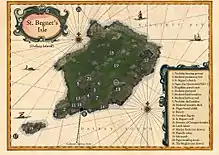 There is evidence it was inhabited in the 4th millennium BC (6,000 years ago) and was also used as a Viking base. A number of early medieval pieces of pottery and glassware were found on the island. Some of these artefacts came from the Mediterranean area, possibly Turkey or Greece.[7] It was an important site of pilgrimage in the medieval period as evidenced by the prominence of the island on early maps. One such, Danti's map of 'Isole Britaniche', painted on the wall of the Palazzo Vecchio in Florence (c. 1560) survives as a remarkable record. It was believed that 'taking' water from the well attributed to the saint could cure scurvy. Recent tests of the water show that it has high levels of vitamin C (the cure for scurvy), probably due to its position below a salt marsh. There are ruins of a church, dating to the 7th century, which is named for St Begnet. An older wooden church was probably here before the present stone one was built. Another church in nearby Dalkey also named for St Begnet may have been a 'base' for pilgrims before they crossed the sound to the island. 'Pilgrim badges' would have been sold in the town which would be eventually sewn into their burial shroud to prove that they had undertaken the pilgrimage, helping their journey through the gates of heaven. On the orders of Henry VIII as part of his dissolution of the monasteries, St Begnet's was raided in 1539. The ornaments and plate raised 36 shillings for the crown.