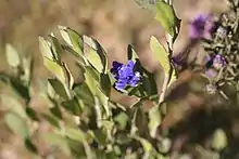 Floral buds grow during June and October. The petals (corolla) are blue or mauve and are usually 8 to 15 mm (0.3 to 0.6 in) in length. The petals are auriculate and do not have spurs. Both the inside and outside of the corolla are hairy; the outside hairs are particularly dense. The hairs of the corolla are pale grey.[4] The flowers of D. altissima are notable by the cup at the tip of the style. Each style is 4 to 4.5 mm (0.15 to 0.18 in) long and is smooth. The anthers at the tips of filaments are connate. On the flowers of D. altissima, bracteoles are present and cover the outside of the bud in its early stages of flowering. The bracteoles are hairy, obloid and are 4.5 to 5.5 mm (0.18 to 0.22 in) in length.[2][4] Dampiera altissima has epigynous flowers, with the ovary of each flower sitting below the petals. The plant has 1-2 ovules, which are upright.[5] The calyx lobes, each 1 to 2 mm (0.04 to 0.08 in) in length, are equally winged and have high density of hairs. The outer lobes are each 5.5 to 12 mm (0.22 to 0.5 in) in length and are unequally winged. The wings are 1.2 mm (0.05 in) wide on the narrower side of the outer lobe and 3 to 3.2 mm (0.12 to 0.13 in) wide on the broader side.[2] The pedicels are generally 3 mm (0.12 in) in length and are hairy. The inflorescence branches are usually 9 to 21 mm (0.35 to 0.83 in) in length).[5] There is one flower per floral axis.[5]