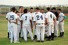 The Bet Shemesh Blue Sox in a team huddle in 2007, one of six teams to play in the inaugural season of the Israel Baseball League