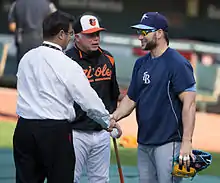 Duquette (left) with Buck Showalter (middle) and Luke Scott (right) before a game on May 17, 2013