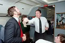 Rohrabacher served as assistant press secretary to Ronald Reagan during his 1976 and 1980 presidential campaigns.[9] Rohrabacher then worked as a speechwriter and special assistant to President Reagan from 1981 to 1988.[10] During his tenure at the White House, Rohrabacher played a leading role in the formulation of the Reagan Doctrine.[10]