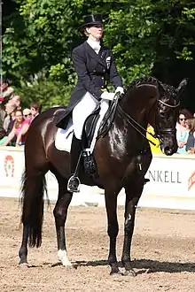 The Danish Warmblood or Dansk Varmblod is a Danish breed of modern sport horse, established in the mid-twentieth century and used mainly for dressage and show-jumping.[4]: 66 Like other European warmblood breeds, it is a performance breed: any suitable horse of any origin may be admitted if it passes a strict performance test. Hanoverian, Holsteiner, Swedish Warmblood and Trakehner are among those that have contributed to the breed.[3]: 459