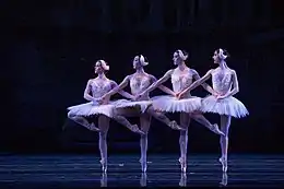 Lev Ivanov's choreography—created for the 1895 revival of Swan Lake—was meant to imitate the way cygnets huddle and move together for protection. Four dancers enter the stage in a line and move across with their arms crossed in front of one another, grasping the next dancers' hands. They move sideways, doing sixteen pas de chat. Ideally the dancers move in exact unison. At the very end, they break their chain and try to "fly", only to drop to the ground.