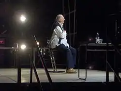 In 2005, Fo revealed plans to run for Mayor of Milan, the most economically important city in Italy, the following year. He said it was part of his ongoing fight to rid Milan of Berlusconi's political colleague Gabriele Albertini, the incumbent mayor.[102] Ostracised by Italian television (both state—RAI having shunted his latest show off to a graveyard slot—and commercial—three quarters owned by Fo's long-time adversary Berlusconi), Fo instead elected to campaign on stage.[103] Under the slogan "I am not a moderate", he opposed the centre-right administration's plans to demolish parts of the city centre and vowed to chase out those "money-grabbing bastards who have run this city for decades".[104][105] Securing 23.4% of the vote in the primary election of centre-left The Union in January 2006, he was ultimately unsuccessful, finishing second to Milan's former police chief Bruno Ferrante.[106]