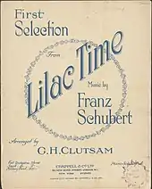 In 1922, in England, Das Dreimäderlhaus was adapted as Lilac Time by Adrian Ross with music by George H. Clutsam. Clutsam, an Australian composer, moved to London and wrote, among other things, a 1912 biography of Schubert.[10] Later, he turned to the more profitable field of composing scores for musical comedies. Clutsam's adaptation hews more closely to Berté's original than does Romberg's. Lilac Time opened at the Lyric Theatre on December 22, 1922, and ran for 626 performances,[11] The production was directed by Dion Boucicault; the musical director was Clarence Raybould.[12] The cast at the London premiere was: