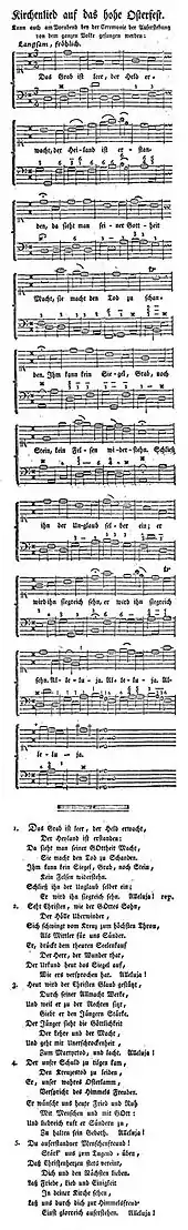 "Das Grab ist leer, der Held erwacht" is a new poetry in the spirit of Klopstocks. The original text had five stanzas of eight lines each, reflecting the resurrection of Jesus, closing each stanza with a threefold Alleluia. Of these stanzas, only the first is still common, but was expanded by two stanzas, first found in an 1866 hymnal from the Diocese of Münster. The hymnal Sursum Corda of 1874 for the Diocese of Paderborn presented these stanzas with a variant of the melody. They appear in the Gotteslob for the Diocese of Hamburg as GL 771 as follows:[6]