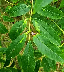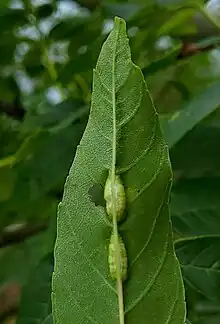Most of the gall is on the underside of the main vein, where it forms a narrow green pouch. There can be several on a leaf, ranging in size from 5 mm to 30 mm, although they can coalesce. Each contains an orange larva. There is a slit-like opening on the upperside of the leaf. The galls can be found from June to October and can also be found on the petiole and rachis.[1][2] It is found on Fraxinus angustifolia & subsp., F. excelsior, F. ornus and F. oxycarpa.[3]