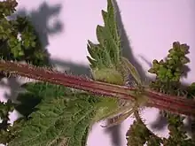 The nettle pouch gall develops in leaf veins, leaf petioles, flower stalks and sometimes the stem of Urtica dioica and Urtica urens. This structure is caused by the gall midge or gnat Dasineura urticae,[1] also spelled Dasyneura urticae.[2] Synonyms are Perrisia urticae and Cecidomyia urticae.[3]