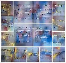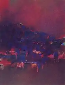 In 1981, Blackburn took up a position as a Visiting Professor at Georgetown University in Washington D.C.[10] At this time he became influenced by the vertical perspectives of the American cityscape, and began to experiment with electronic imagery and collage techniques. However, after this short period of experimentation Blackburn realised that his 'inner life was based in the natural world, not the city',[11] and subsequently embarked on a complex and long-running sequence of transcendent pastel drawings known as the Landscape Vision series. In the early 90s, Blackburn returned to Huddersfield to care for his mother, who died in 1993. He remained in the north of England, where he continued to observe the landscape and work on his project of visionary panels, until his death in 2016.