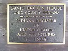 The David Brown House (constructed circa 1825) is located 4 miles (6.4 km) north of Rising Sun, Indiana and approximately 3 miles (4.8 km) south of Laughery Creek. The log home was placed on the Indiana Register of Historic Sites and Structures on October 25, 1978.