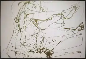 Even though he's primarily known as a sculptor, Smith painted and drew throughout his life. By 1953, he was producing between 300 and 400 drawings a year. His subjects encompassed the figure and landscape, as well as gestural, almost calligraphic marks made with egg yolk, Chinese ink and brushes and, in the late 1950s, the "sprays".[2] He usually signed his drawings with the ancient Greek letters delta and sigma, meant to stand for his initials.[12] In the winter of 1963–64, he began a series known as the "Last Nudes". The paintings in this series are essentially drawings of nudes on canvas. He drew with enamel paint squeezed from syringes or bottles onto a canvas spread onto the floor.[13] Untitled (Green Linear Nude) is painted in a metallic olive green enamel, and exemplifies the artist's late action paintings.