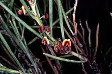 Daviesia oxylobium is an erect, glaucous, bushy shrub that typically grows to a height of up to about 1 m (3 ft 3 in). Its phyllodes are crowded, erect and club-shaped to cylindrical, 20–70 mm (0.79–2.76 in) long and 1.0–1.5 mm (0.039–0.059 in) wide with a sharply pointed tip. The flowers are arranged in leaf axils in up to three groups of three to five, each group on a peduncle 1.0–1.5 mm (0.039–0.059 in) long, the rachis 1–4 mm (0.039–0.157 in) long, each flower on a pedicel 1–3 mm (0.039–0.118 in) long with triangular bracts at the base. The sepals are 2.5–3.0 mm (0.098–0.118 in) long and joined for most of their length apart from five small teeth. The standard petal is broadly egg-shaped with a notched centre, 4.0–5.5 mm (0.16–0.22 in) long and 5.5–6.0 mm (0.22–0.24 in) wide, and yellow with a deep pinkish-red base. The wings are about 5 mm (0.20 in) long and pinkish-red, the keel 4.0–4.5 mm (0.16–0.18 in) long and dark red. Flowering occurs in July and August and the fruit is an inflated, triangular pod 14–18 mm (0.55–0.71 in) long.[2][3]