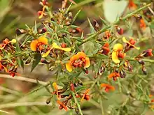 - Daviesia ulicifolia subsp. aridicola G.Chandler & Crisp[11] has narrow elliptic, or narrow egg-shaped to linear phyllodes 8–17.5 mm (0.31–0.69 in) long and 1.3–2.5 mm (0.051–0.098 in) wide with two to seven flowers in leaf axils, the standard petal less than 4.5 mm (0.18 in) wide and orange with a red centre;[3][12][13]