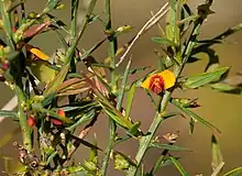 - Daviesia ulicifolia subsp. incarnata G.Chandler & Crisp[14] has narrow elliptic, or narrow egg-shaped to linear phyllodes 9.5–22 mm (0.37–0.87 in) long and 1–3 mm (0.039–0.118 in) wide with one to seven flowers in leaf axils, the standard petal 7–8 mm (0.28–0.31 in) wide and reddish-orange with a dark red base and a yellow centre;[3][12]