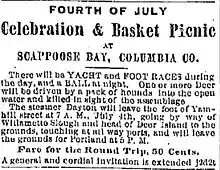 {{cite news}}: CS1 maint: numeric names: authors list (link) - 1 2 3 4 5 6 "Fourth of July Celebration and Basket Picnic". Morning Oregonian (advertisement). Vol. 19, no. 5, 706. Portland, OR: Henry L. Pittock. Jul 3, 1879. p.2, col.3.