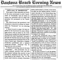 At its conception the Boardwalk was originally called "the Broadwalk" as it was a broad stretch of cement, and not boards. Many references can be found referring to the attraction as Broadwalk. The common name became the Boardwalk after the editor of the local newspaper committed to calling it that in the newspaper, and it caught on. The editor was concerned with the advertising value of the term Boardwalk over Broadwalk (as Daytona at that time was looking to market as the Atlantic City of the South), as well as the "vulgar connotation" of using the term "broad" in relation to women who may be walking there.[5]